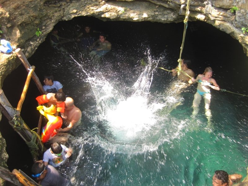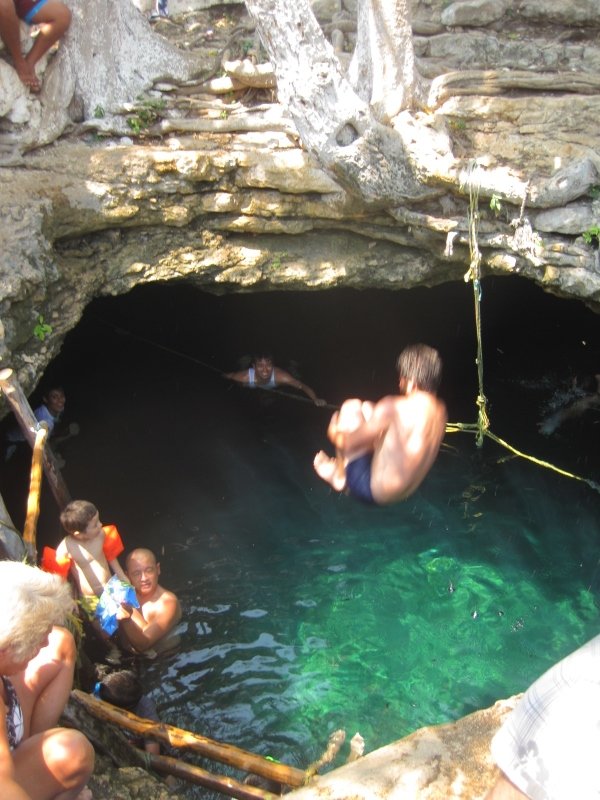 Ida and I began the day at a cenote (sinkholes in the lime-rich soil, mostly in Yucatan, but also present in Quintana Roo and Merida, which sometimes connect to underground cave systems and underground rivers). The water was perfectly clean and clear and of the kind of temperature which makes you want to stay in there forever. This one was mostly for locals as it didn’t appear on any cenote list that a tourist would see. The edge of the sinkhole was right over the water, so I was able to dive and cannonball in, enticing the kids to do the same. We dove into the depths of the cenote, perfectly visible in the crystal clear waters, and swam to the far reaches of the cave where stalagmites stood guard to a world which required scuba gear to behold. It was a perfect morning and early afternoon! We then came back to the city and walked around eating coconut, coffee and chocolate ice cream, churros, kibis, panuchas… We tried on some guayaberas and hats which made me momentarily long for the suits I could no longer wear. The next day we walked through the paseo Mantejo and the rest of the fancier parts of the city. It, along with Avenida Colon, is full of enormous, and I mean enormous, mansions – greatly ostentatious, but still appealing – built with new money at the turn of the 19th century.  They imitate Greek and French architecture, with bright Caribbean colors. We walked along, talking and joking ( I still find it amazing how many inside jokes we share having only known each other a short time), and stopped for some food and cocktails at a place called La Bella Epoca. We sat on a balcony overlooking one of the main streets, plazas, and churches of Merida. There were horse-drawn carriages on the street, someone was playing a guitar and singing trova in a restaurant on the other side, the waiters were super polite, the tables clothed, the paintings of a dreamy time long since passed…